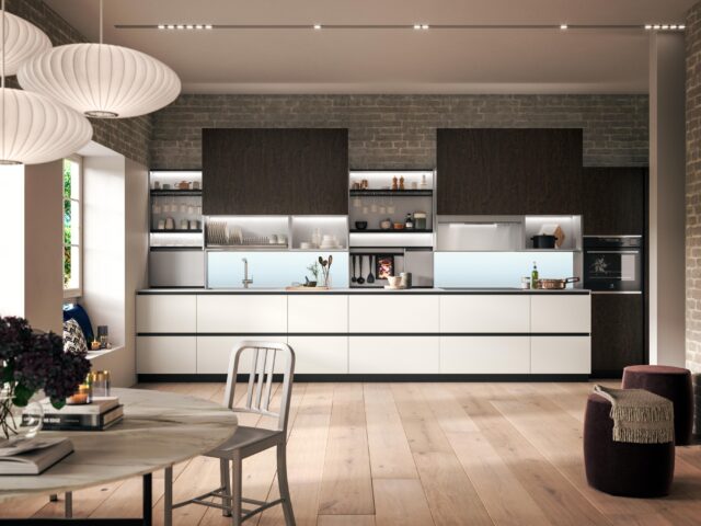 A modern kitchen design that includes industrial and classical influences in an interesting mix of styles. With its play of materials plus full and open volumes, Frame easily fits into any environment; be it a modern setting, a more traditional home or a casual loft-like space with vintage decor.