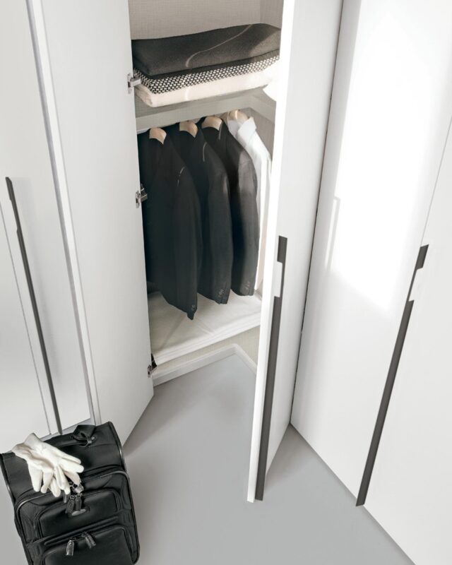 A corner wardrobe that uses all its space. The opening of the two doors of this leaf door version allows easy access to the corner unit, fitted internally with a practical shelf that follows its shape and with essential hanging rails. Description Description Related products Corner wardrobesEND UNIT Read more Corner wardrobesDRESSING ROOM WARDROBE W/ 3 DOORS Read more Corner wardrobesDRESSING ROOM WARDROBE W/ 2 X 45° DOORS Read more
