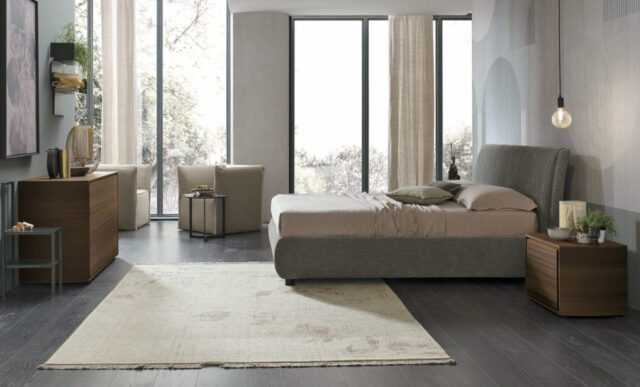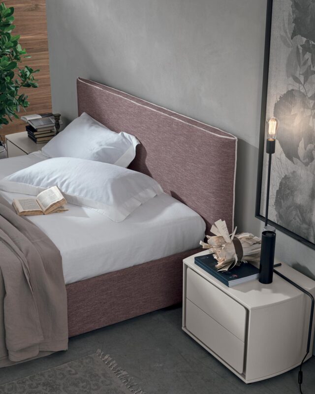 Photo finishes / Tivoli bedside unit in coal oak wood. Chest-of-drawers in matt blue grey 155 lacquer.